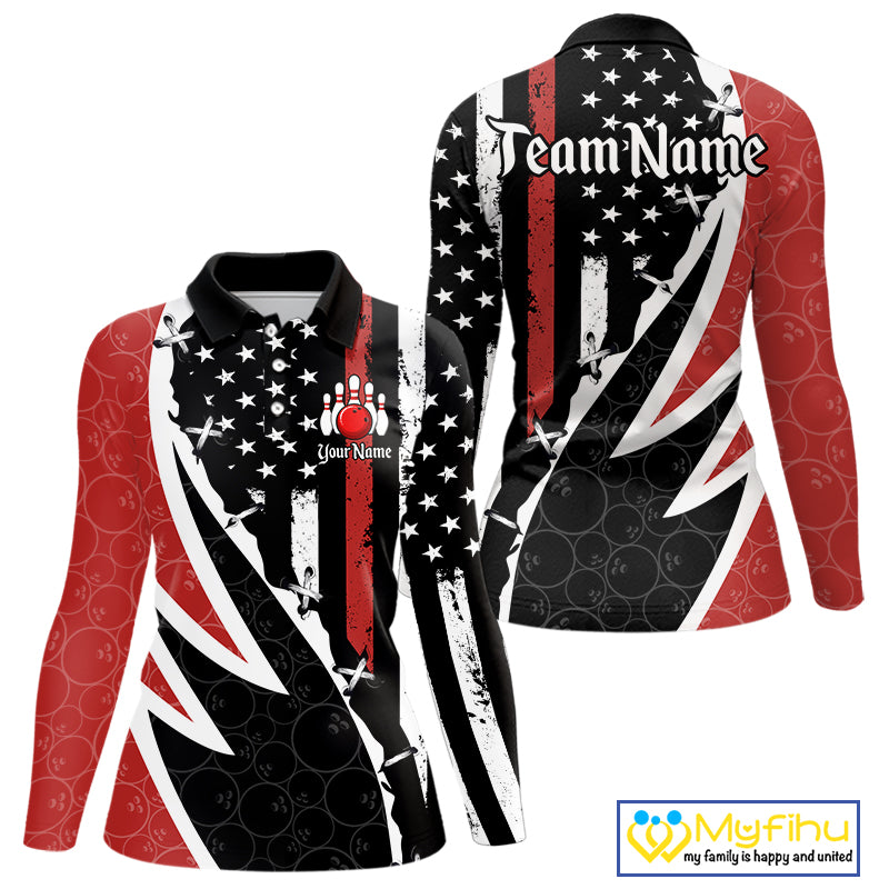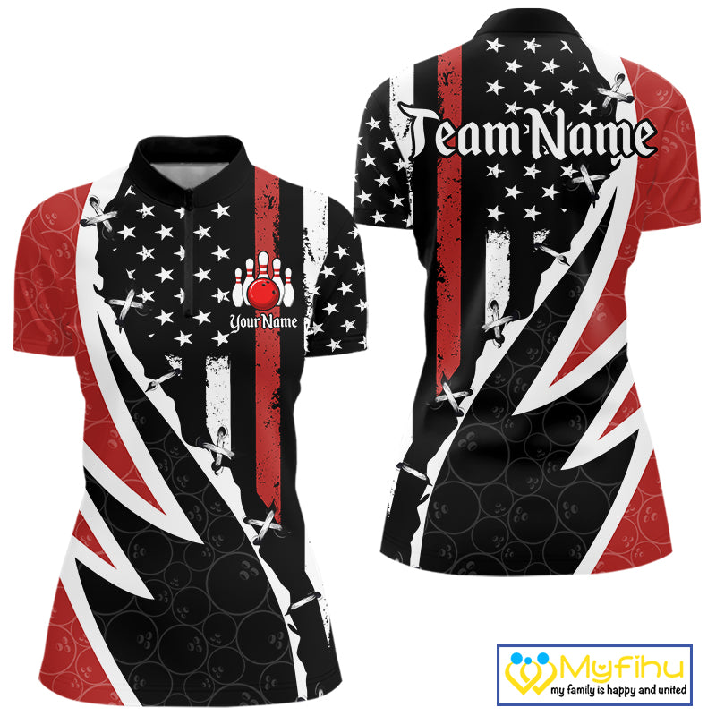 Red, White and Black American Flag Bowling Shirts for Women Custom Patriotic Team Bowling Jersey NQS10429