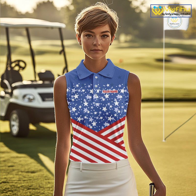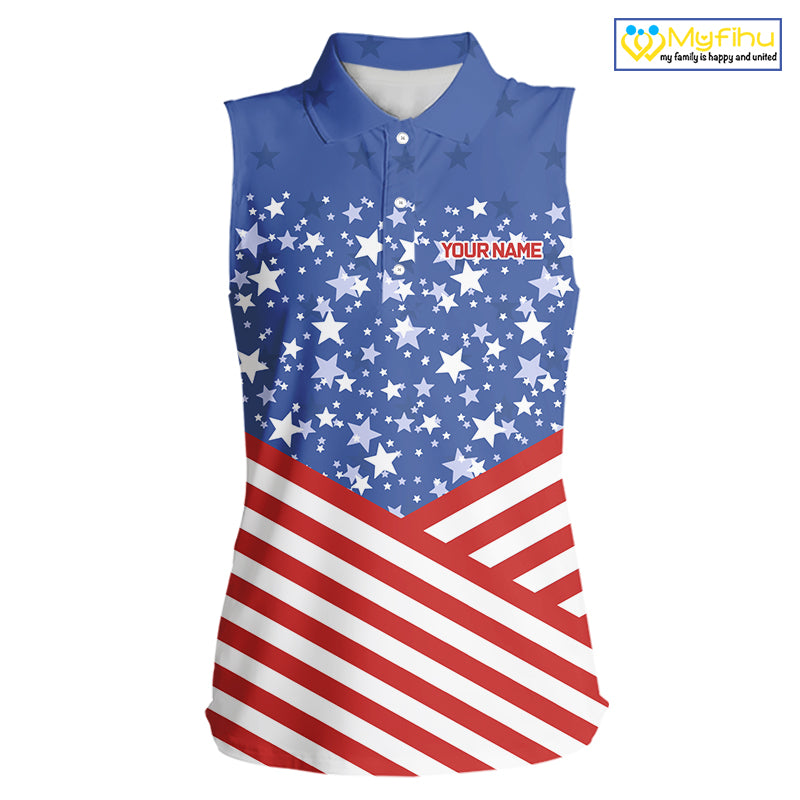 Red, White and Blue Women sleeveless polo shirt Custom American Flag patriotic ladies Golf attire NQS10137