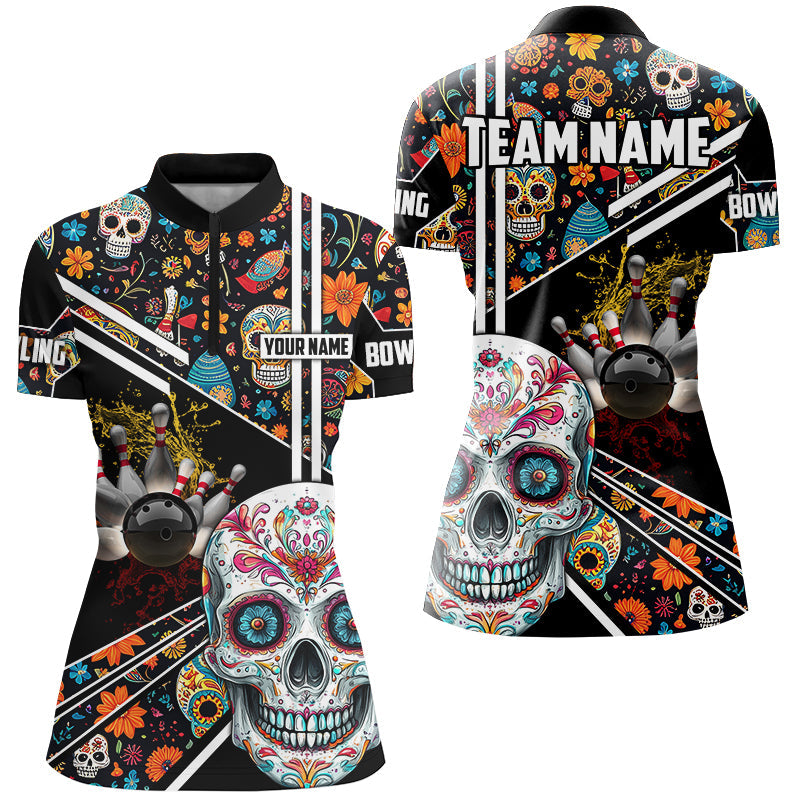 Sugar Skull Pattern Custom Women Team Bowling Polo, Quarter Zip Shirts, Halloween Team Bowling Jerseys NQS8655