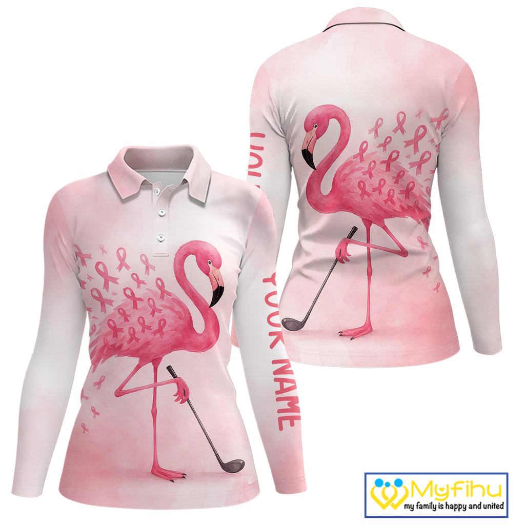 Watercolor Pink Flamingo ribbons Women golf polo shirt Custom Breast Cancer Awareness ladies golf top NQS10512