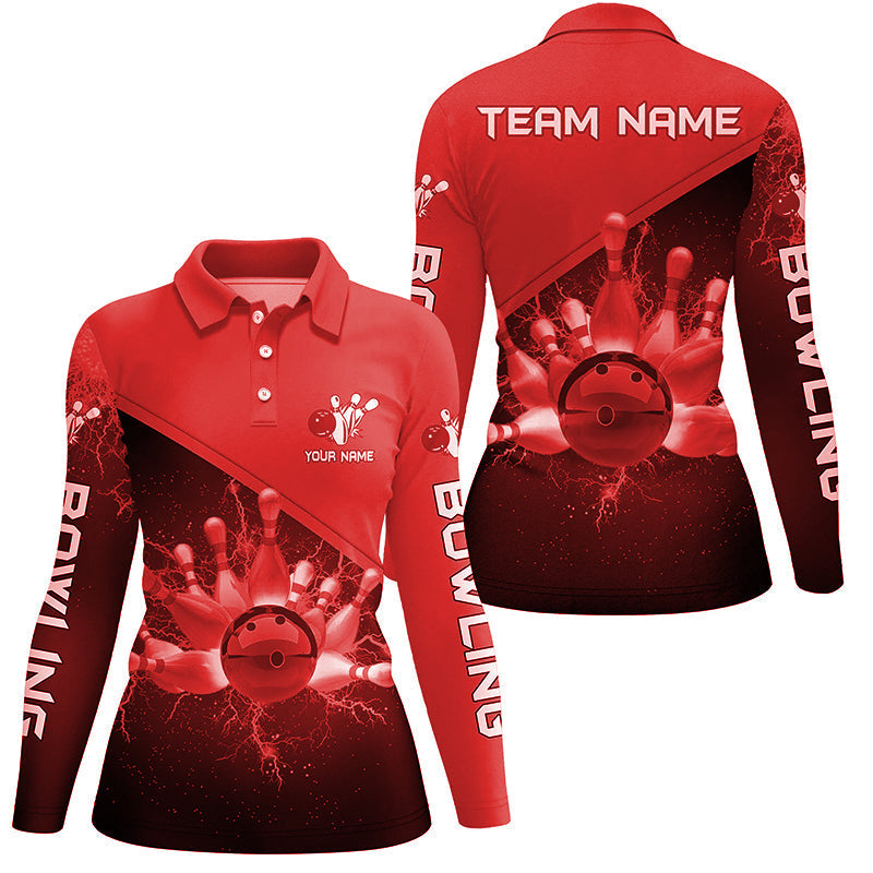 Women bowling polo shirts Custom red lightning thunder Bowling Team Jersey, gift for team Bowlers NQS6622