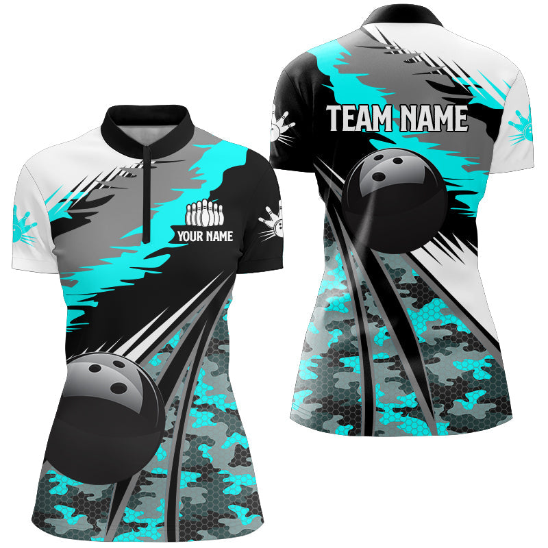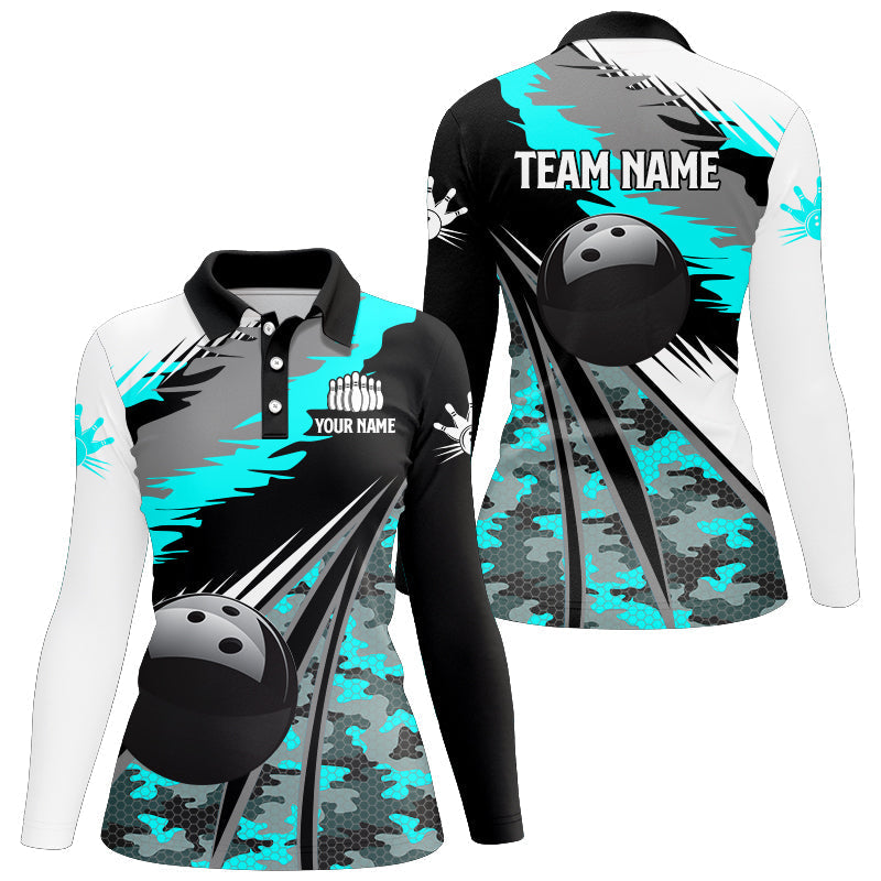 Women bowling shirts Custom black ball Cyan Blue camo Bowling Team Jerseys, gift for Bowler NQS8713