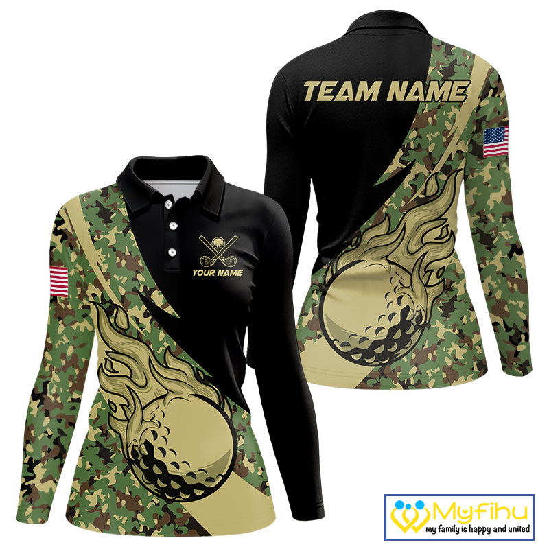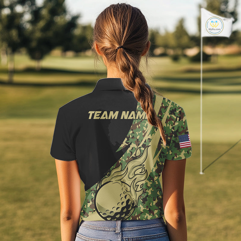 Women Golf polo shirt flame golf ball Custom green camo ladies Golf attire, personalized golf gifts NQS10052
