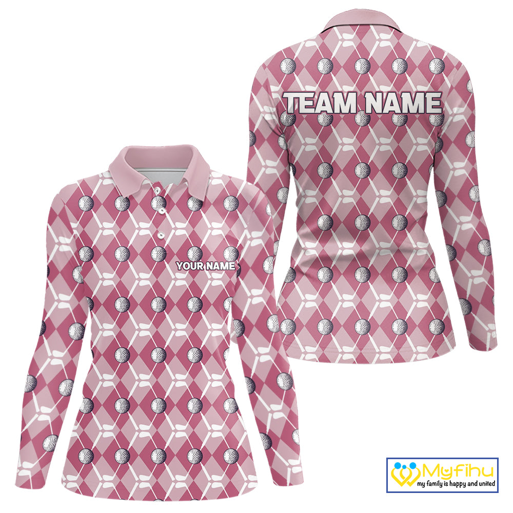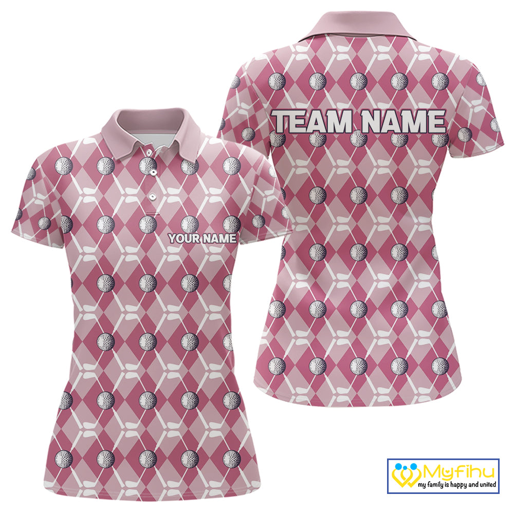 Women golf polo shirts custom pink argyle plaid pattern golf attire for ladies, golfer gifts NQS10443