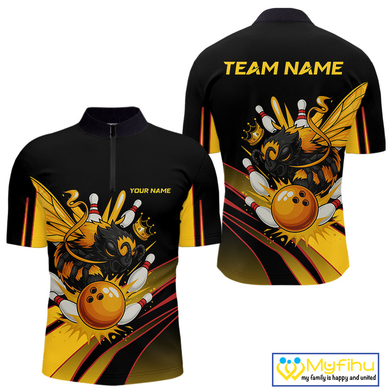 Black and Yellow Bee Bowling Polo, Quarter Zip Shirts For Men Custom Bee Bowling Team Jersey Outfit NQS10362