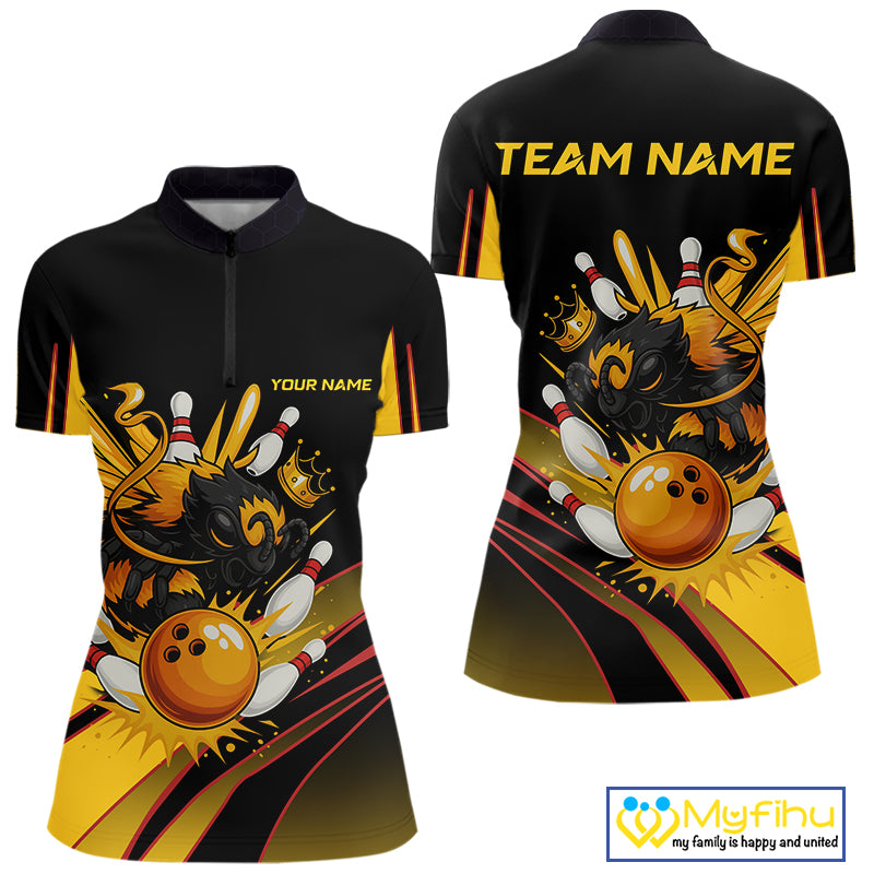 Black and Yellow Bee Bowling Polo, Quarter Zip Shirts For Women Custom Bee Bowling Team Jersey Outfit NQS10362