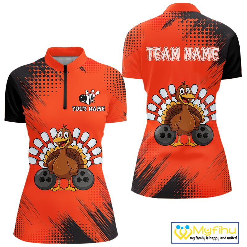 Custom Orange Turkey Bowling Shirt For Women, Thanksgiving Bowling Team Jersey Bowler Outfit NQS10369
