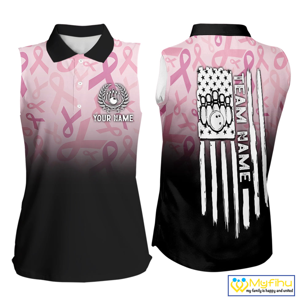Sleeveless polo shirt Custom American flag patriotic Pink ribbon breast cancer bowling team jersey NQS10412