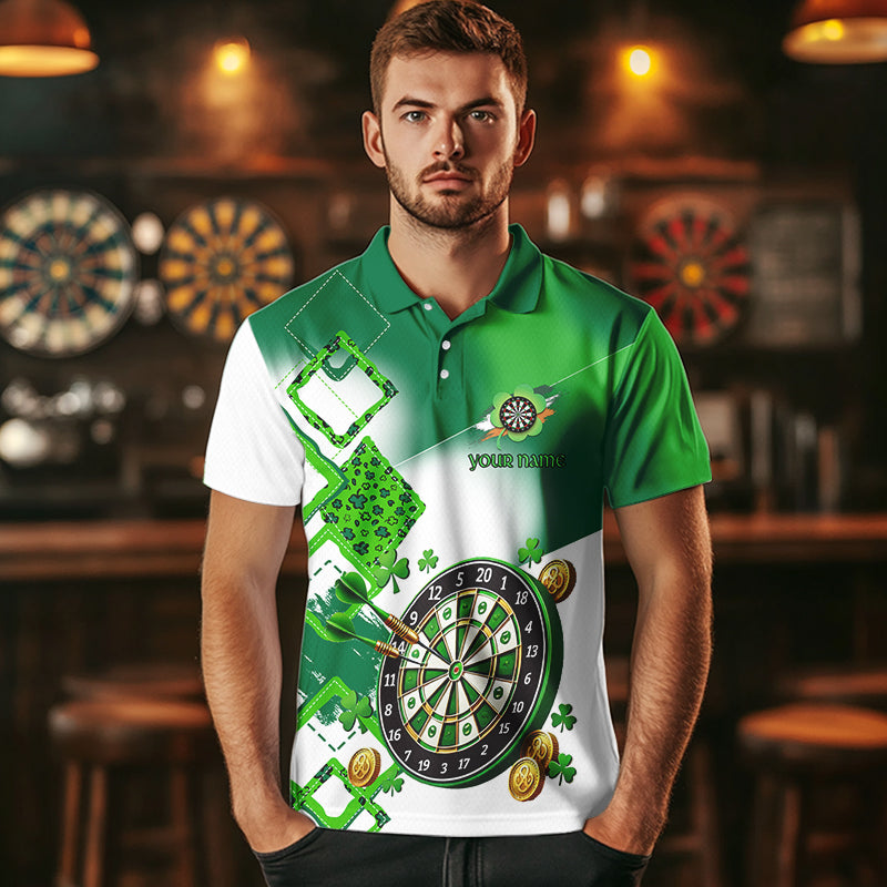 Green shamrock Mens Darts Polo, Quarter Zip shirts Custom St Patrick Day team league darts jersey NQS9557