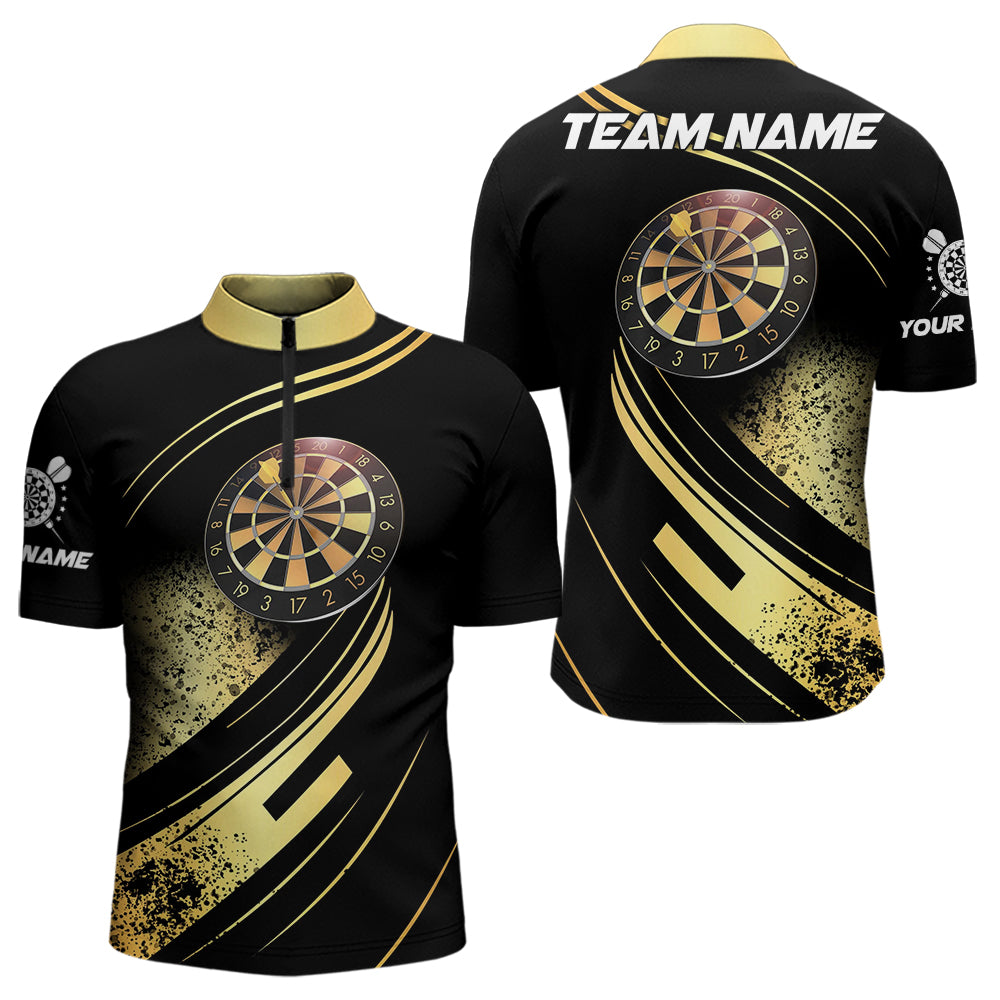 Personalized Gradient Gold And Black Darts Polo, Quarter Zip Custom Dart Shirts For Men Dart Jersey TDM3642