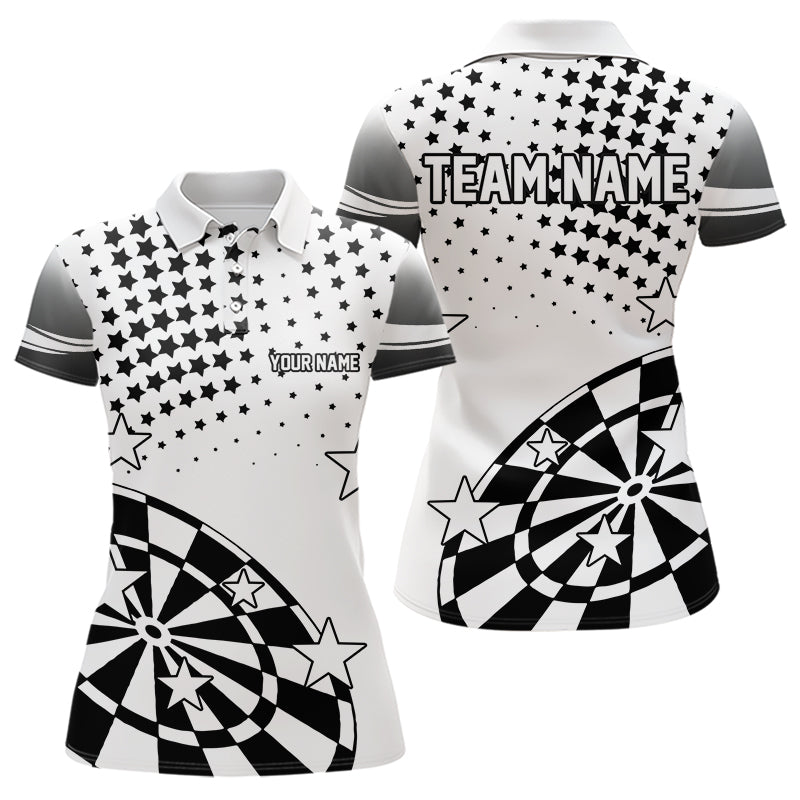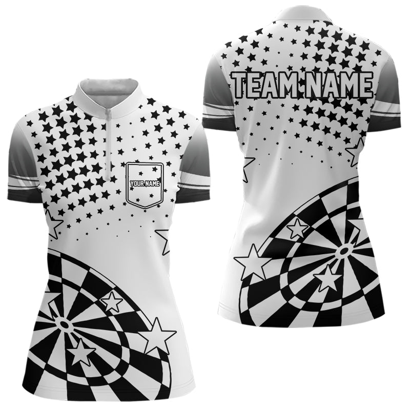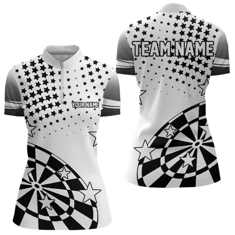 Personalized Black and White Stars Darts Polo, Quarter Zip Shirt For Women Custom Dart Team Jerseys NQS9511