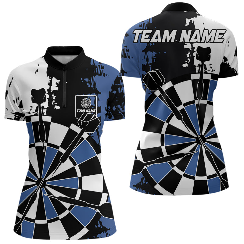 Personalized Black, Blue and White Grunge Darts Shirts For Women Custom Retro Team Darts Jersey NQS9525