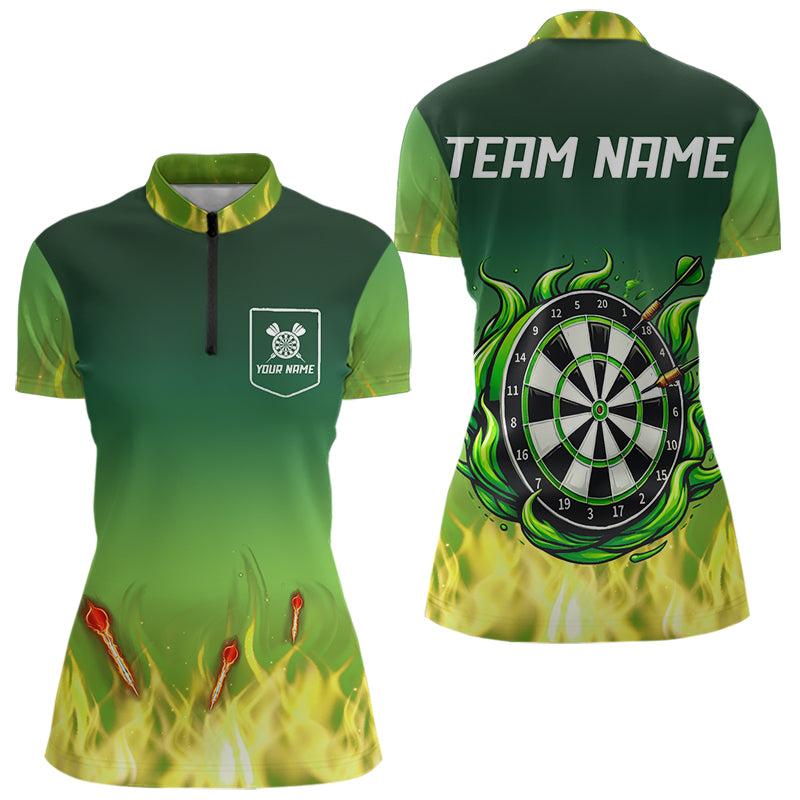 Personalized Yellow Green Flame Darts Polo, Quarter Zip Shirts For Women Custom Fire Team Darts Jersey NQS9558