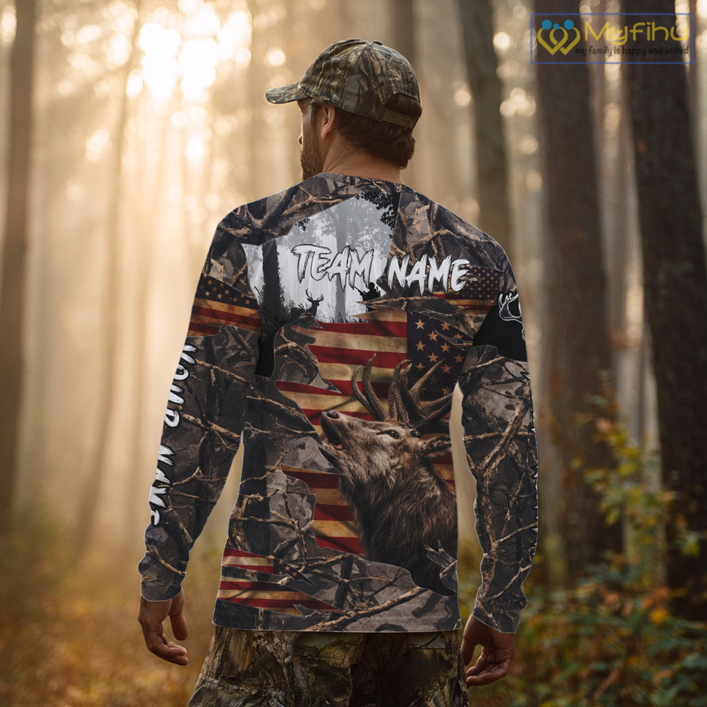 Best Elk Hunting Camo Shirt with Big Buck and US Flag – Hunting Apparel for Men, Hunter Gifts NBT51