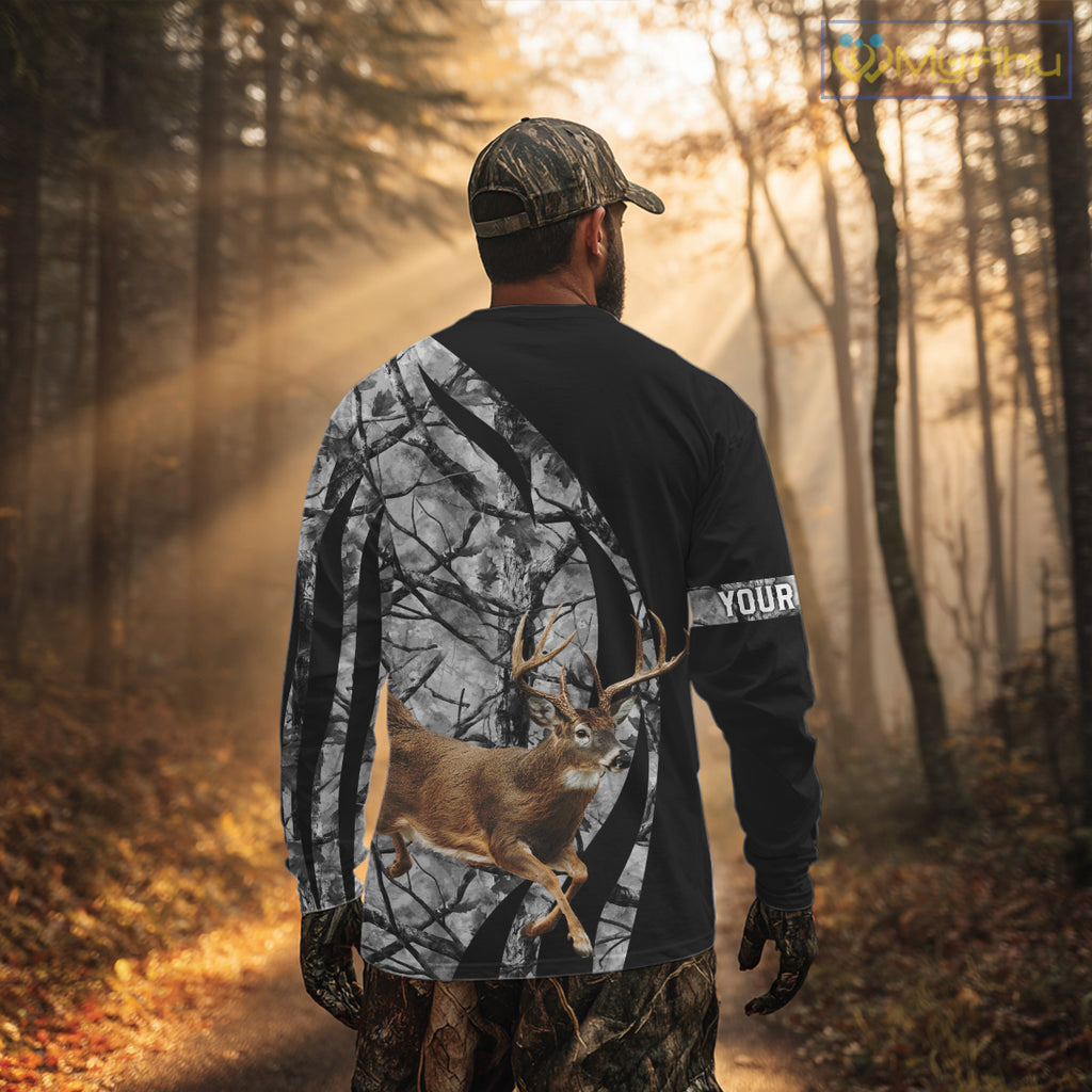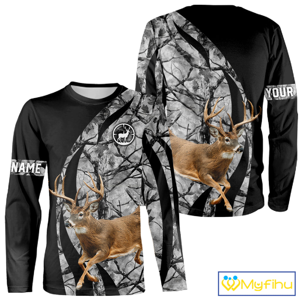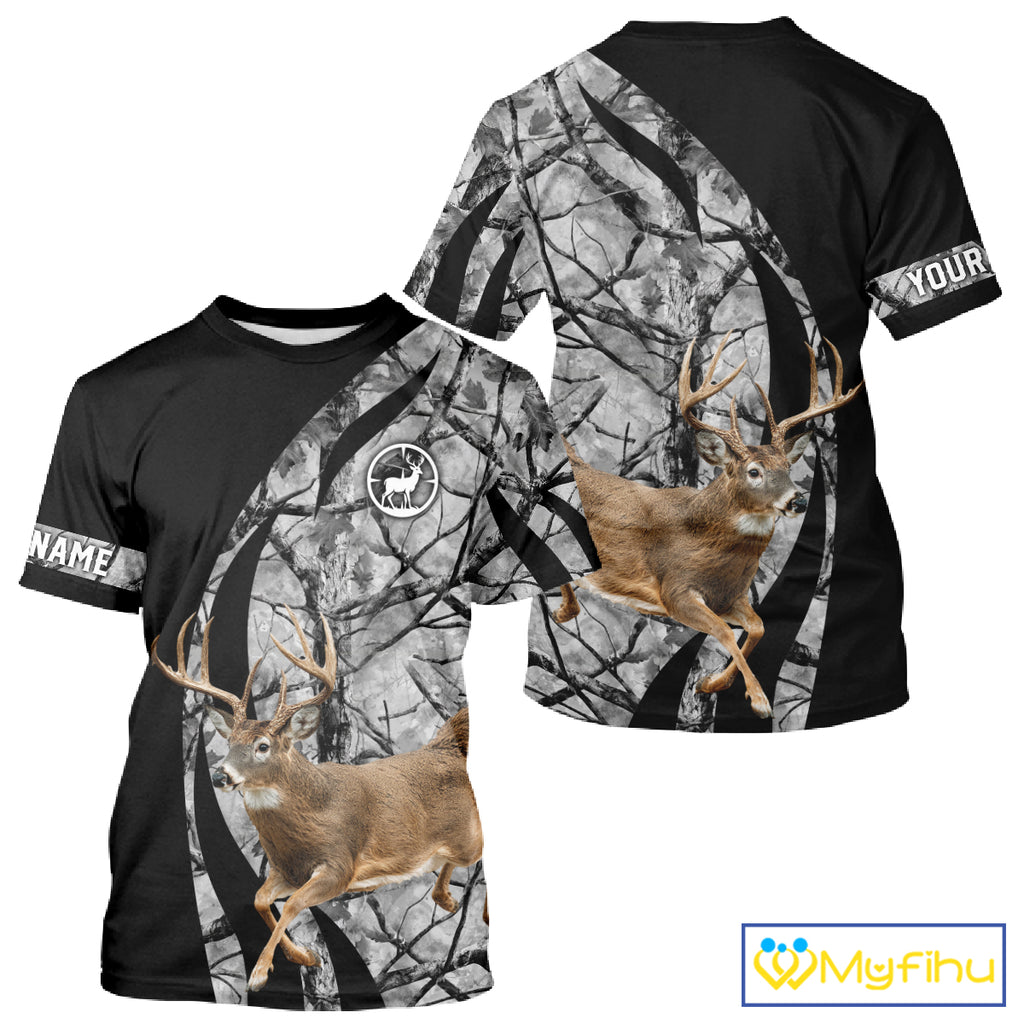 Deer Jumping Hunting 3D Black Gray Camo Custom Name All Over Print Shirt Hunting Shirts NHT206