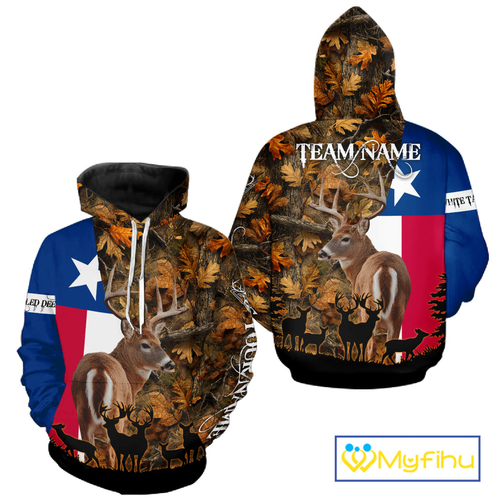 Texas Flag Fall Camo Deer Hunting Hoodie, Longsleeve Shirt - Personalized Name Option NBT12
