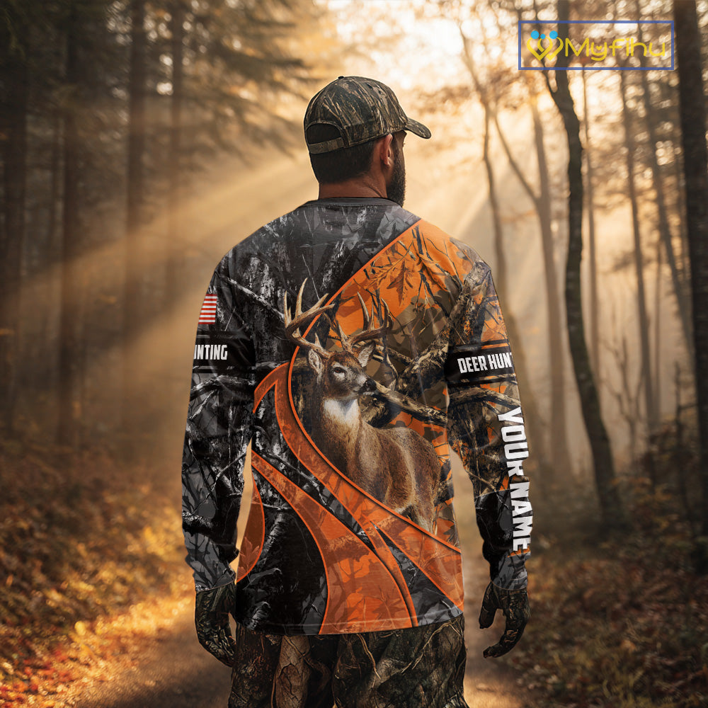 Whitetail Deer Hunting Orange and Black Camo Shirts with US Flag, Personalized Hunting Shirt NBT68