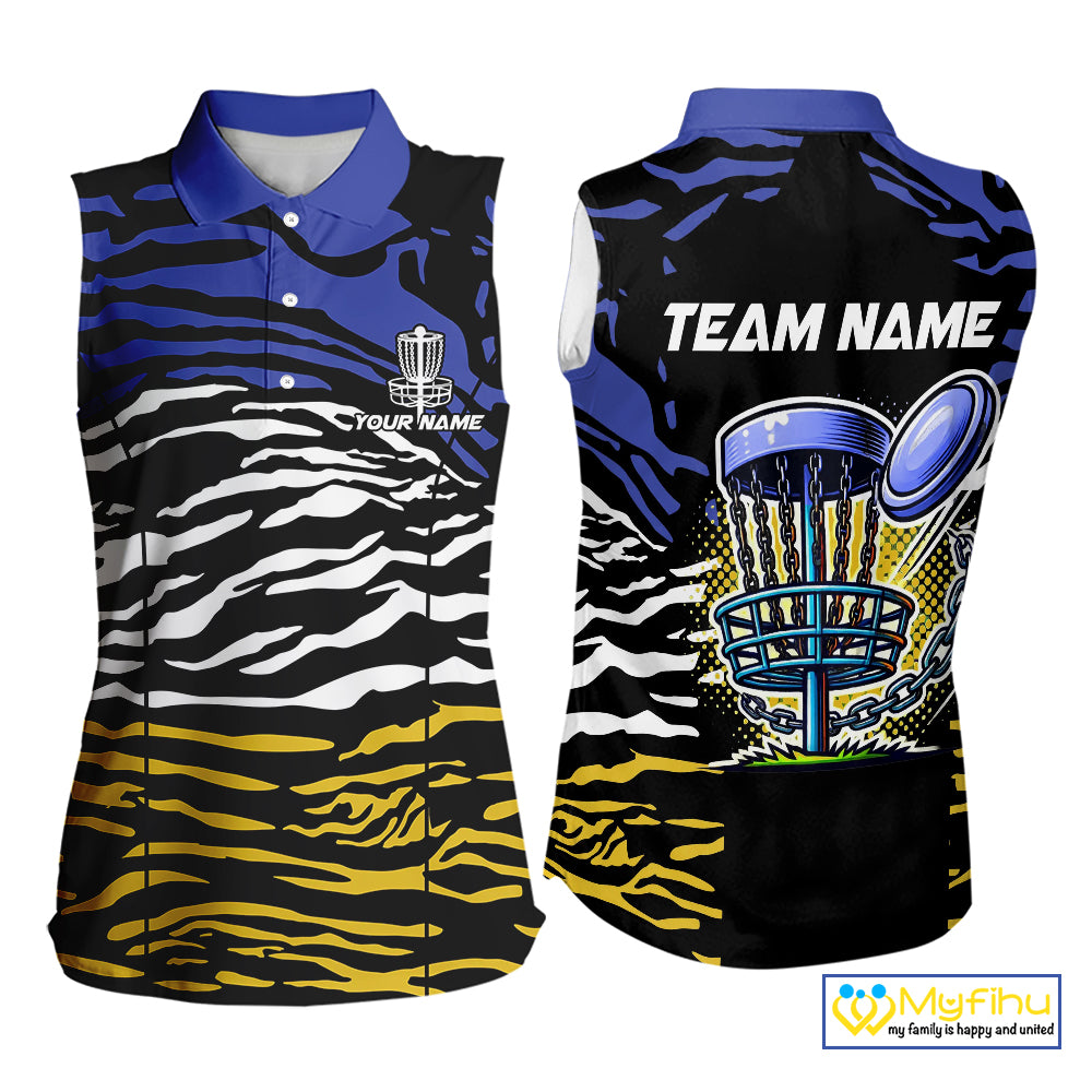 Blue, Yellow and White Tiger Skin Pattern Womens sleeveless polo shirt Custom team disc golf jerseys NQS9804