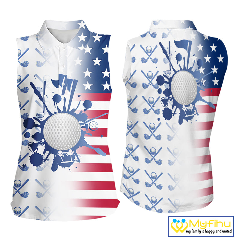 Red, White & Blue American Flag Women Sleeveless Golf polo shirts, patriotic Ladies Golf Outfit NQS10035