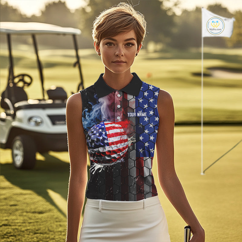 Smoke Golf ball American Flag Women Sleeveless Polo Shirt Custom Patriotic Golf attire for ladies NQS9801