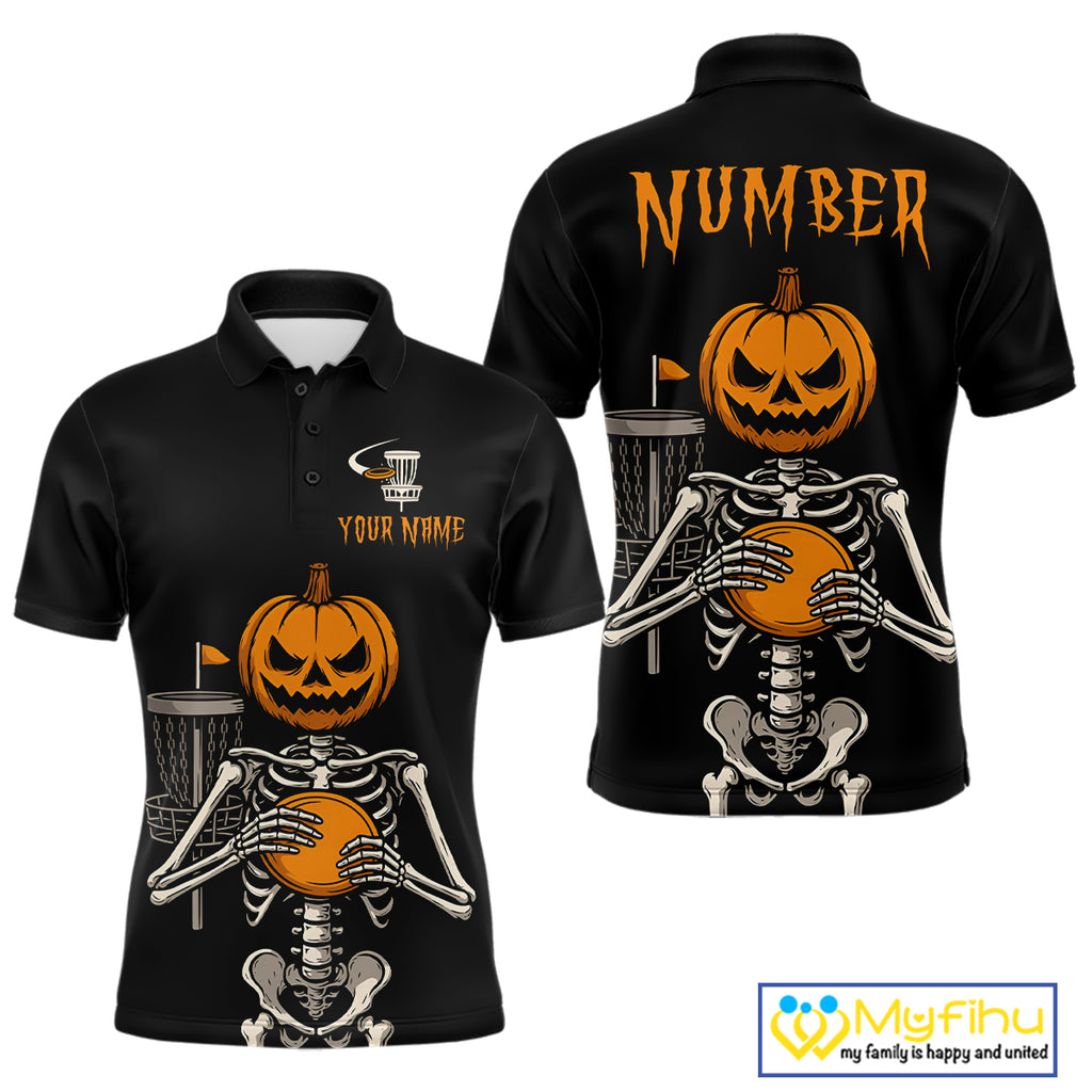 Black and Orange Halloween disc golf skull custom Men disc golf polo shirts, disc golf gifts NQS10788