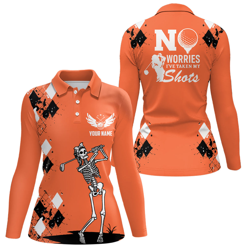 Womens Skull Golf Polo Shirt Argyle Pattern Orange Golf Shirt For Ladies Halloween Golf Gifts LDT0479