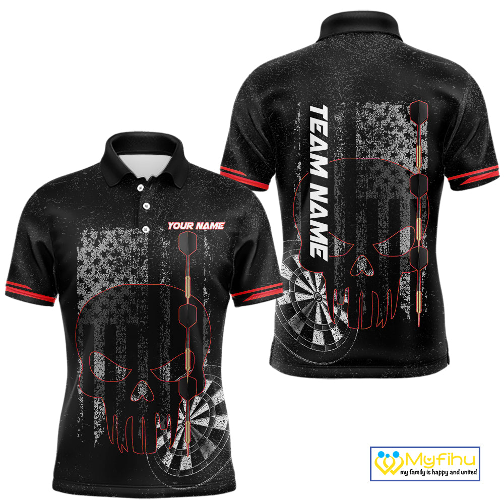 Black & White grunge American Flag Skull Mens Darts Shirt Custom patriotic Team Darts Jersey | Red NQS10749