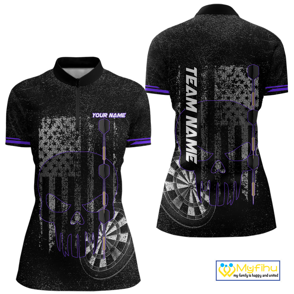 Black & White grunge American Flag Skull Women Darts Shirt Custom patriotic Team Darts Jersey| Purple NQS10750