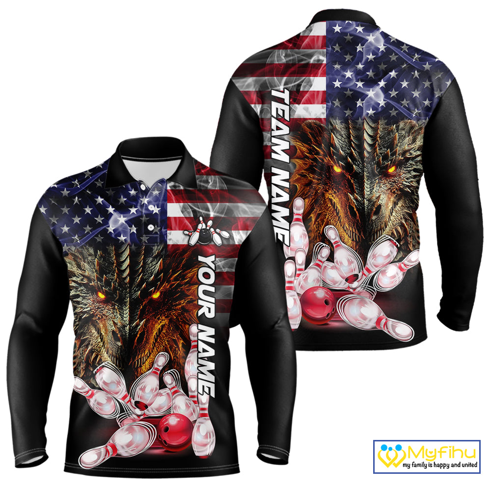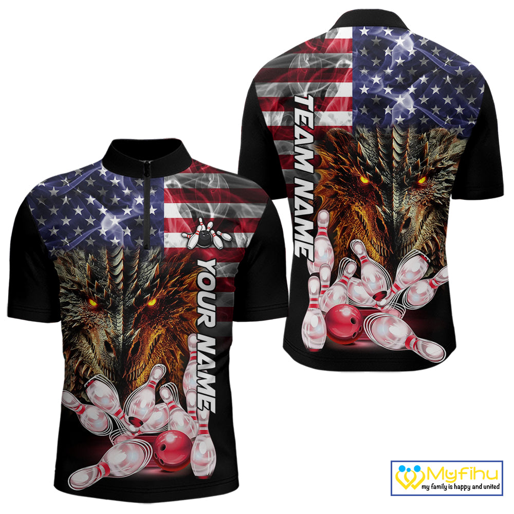 American Flag Dragon Bowling Polo, Quarter Zip Shirts for Men Custom patriotic Team Bowling jerseys NQS10288