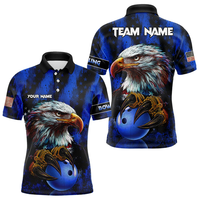 American Flag Eagle Mens Bowling Polo, 1/4 Zip Shirt Custom Name Patriotic Bowling Team Jersey | Blue NQS9755
