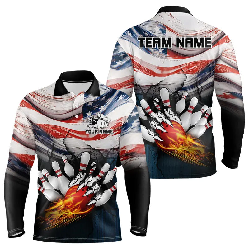 American flag Flame Bowling Polo, Quarter Zip shirts For Men custom patriotic bowling team jersey NQS9416