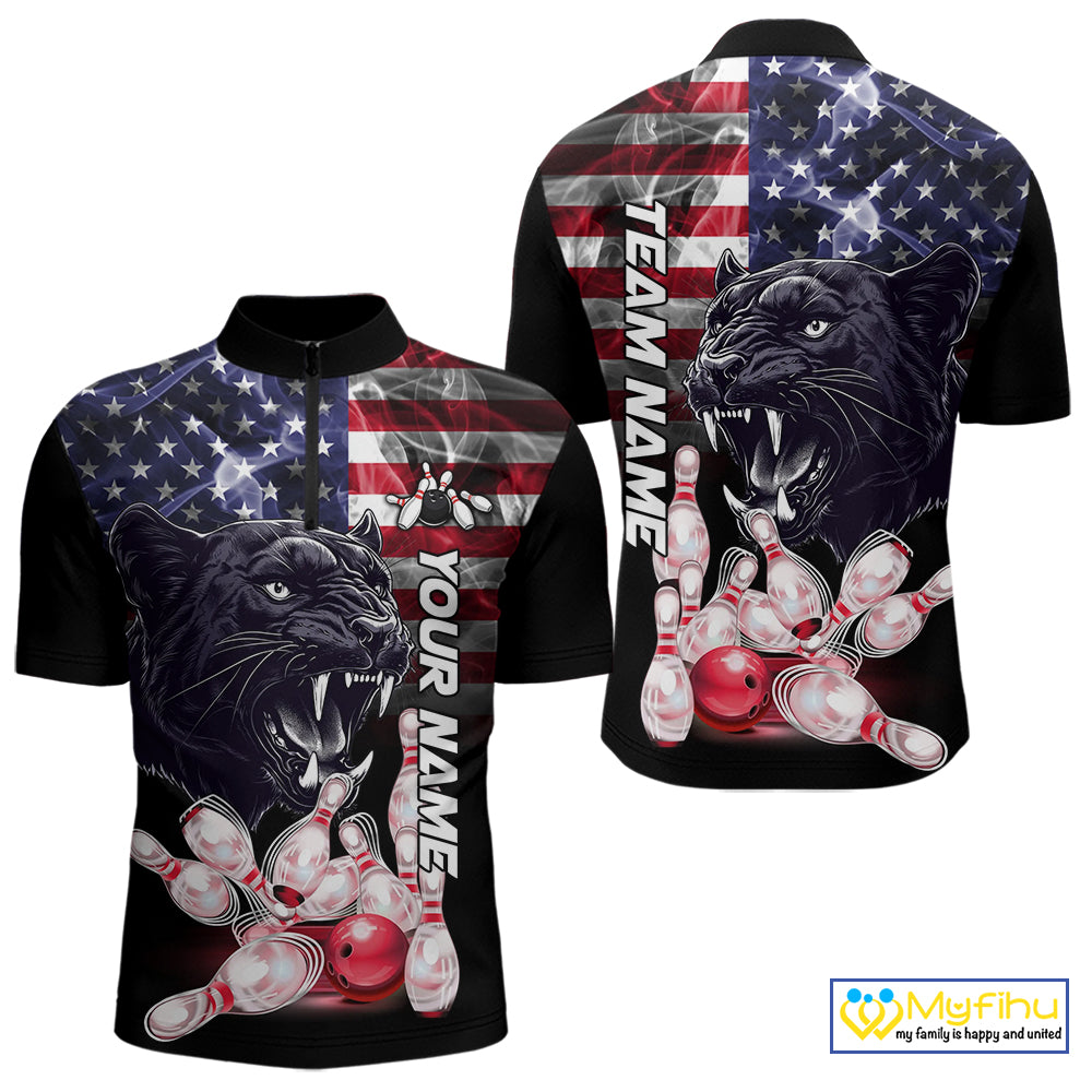 American Flag Panther Bowling Polo, Quarter Zip Shirts for Men Custom patriotic Team Bowling jerseys NQS10289