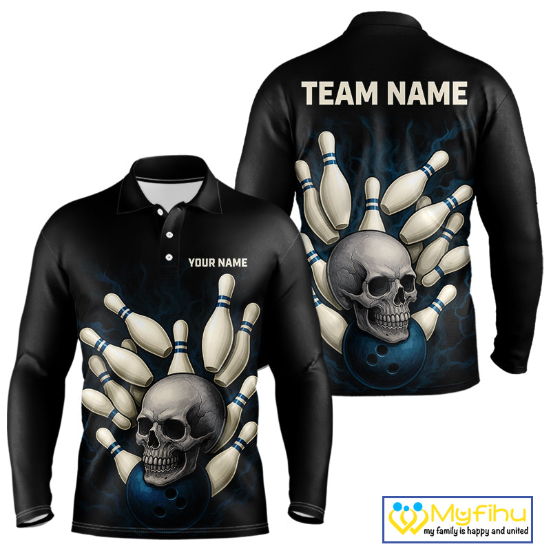 Black and Blue Skull Bowling Ball and Pins Bowling Shirts For Men Custom skull team bowling jerseys NQS9850