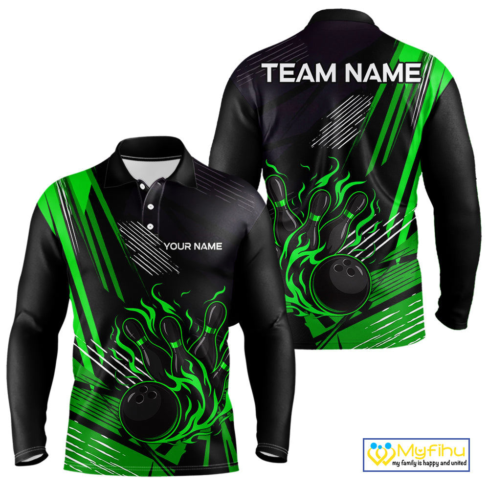 Black and Green Flame Bowling Polo, Quarter Zip Shirts For Men Custom Bowling Outfit Team Jerseys NQS10193