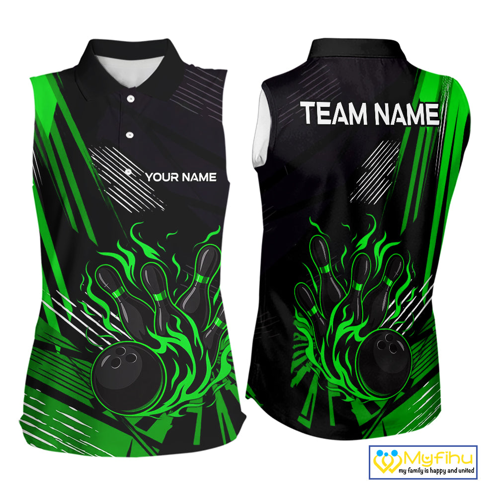 Black and Green Flame Bowling sleeveless polo Shirts Custom Bowling Outfit Team Jerseys NQS10193