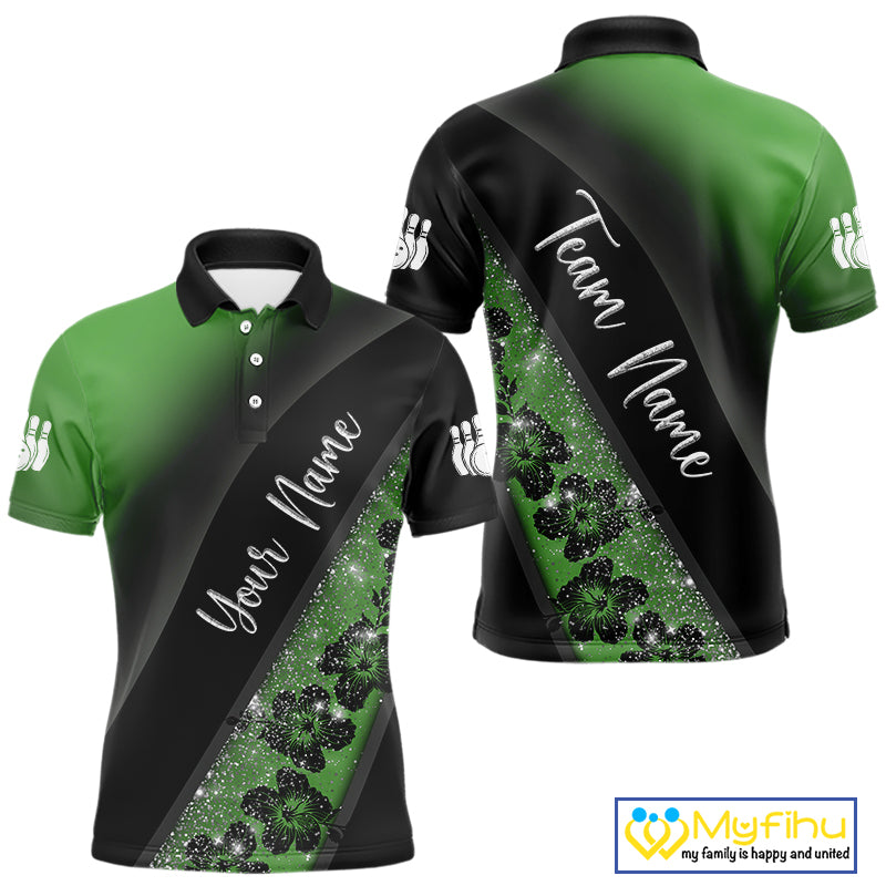 Black and Green Glitter Flower Bowling Polo, Quarter Zip Shirt for Men Custom Bowling Team Jerseys NQS10384