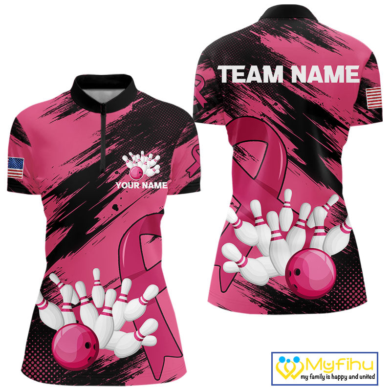 Black and Pink ribbon Bowling shirts for Women Custom breast cancer American flag bowling team jersey NQS10141