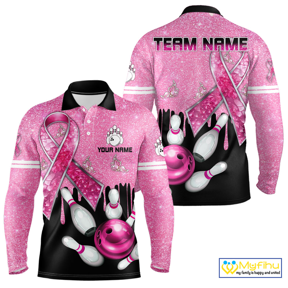 Black and Pink ribbon glitter Bowling Shirts For Men Custom breast cancer team bowling jerseys NQS9950