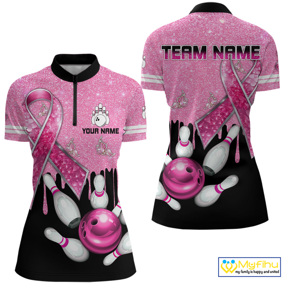 Black and Pink ribbon glitter Bowling Shirts For Women Custom breast cancer team bowling jerseys NQS9950