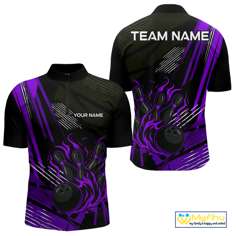 Black and Purple Flame Bowling Polo, Quarter Zip Shirts For Men Custom Bowling Outfit Team Jerseys NQS10194