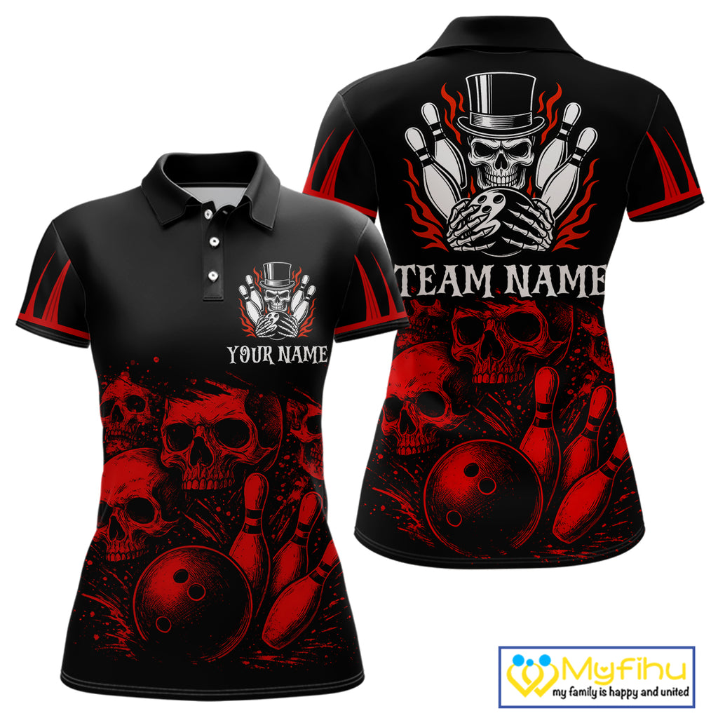 Black and Red Flame Skull Bowling Polo, Quarter Zip Shirts For Women Custom Skull Bowling Team Jerseys NQS9985