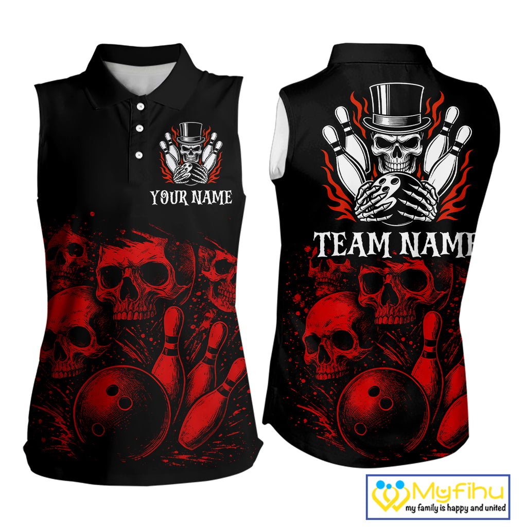 Black and Red Flame Skull Bowling sleeveless polo Shirt For Women Custom Skull Bowling Team Jerseys NQS9985