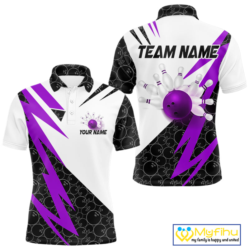Black and White Bowling Polo, Quarter Zip Shirt for Men Custom Lightning Team bowling jersey | Purple NQS10003