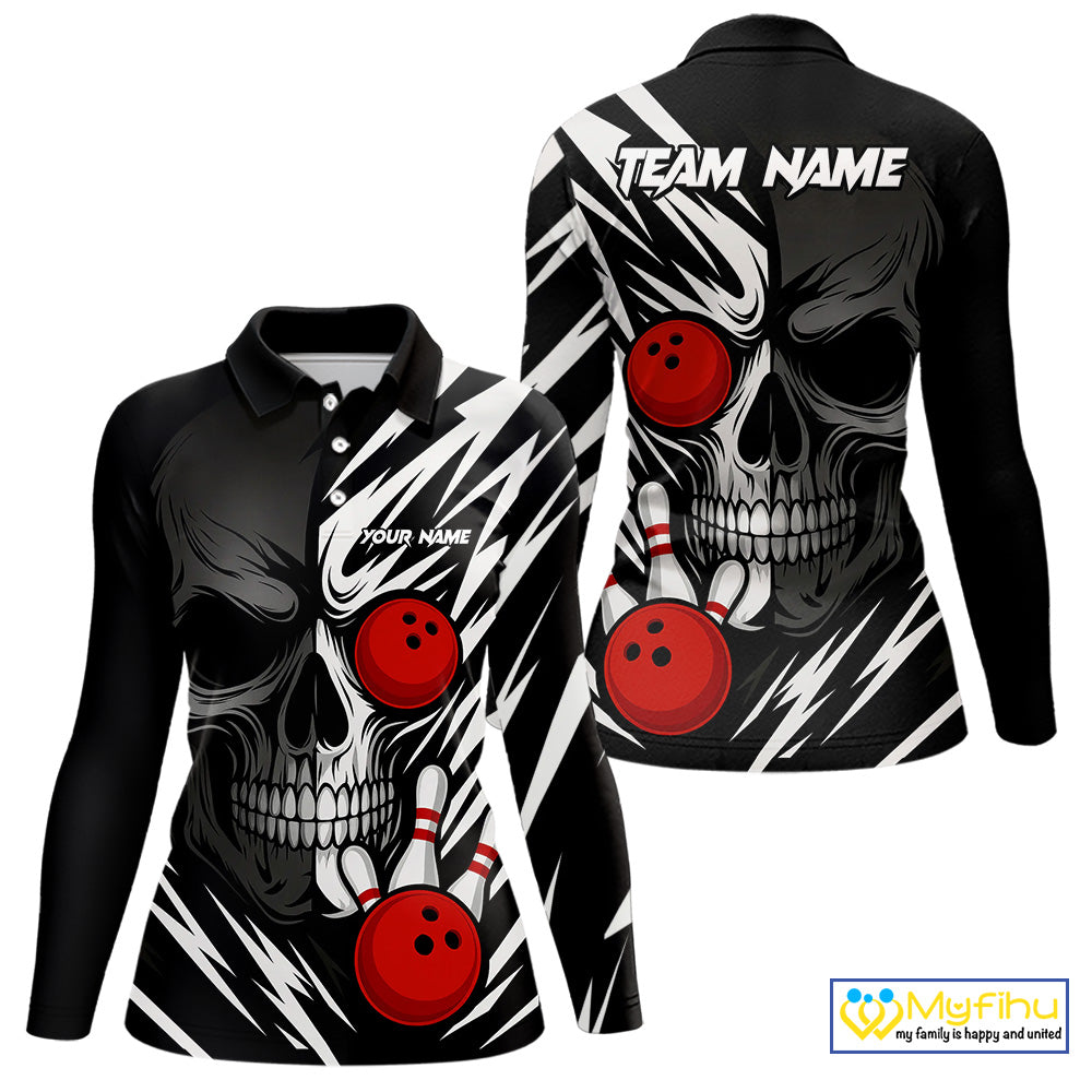 Black and White Skull Bowling Polo, Quarter Zip shirts for Women Custom Skull Team Bowling Jerseys NQS10261