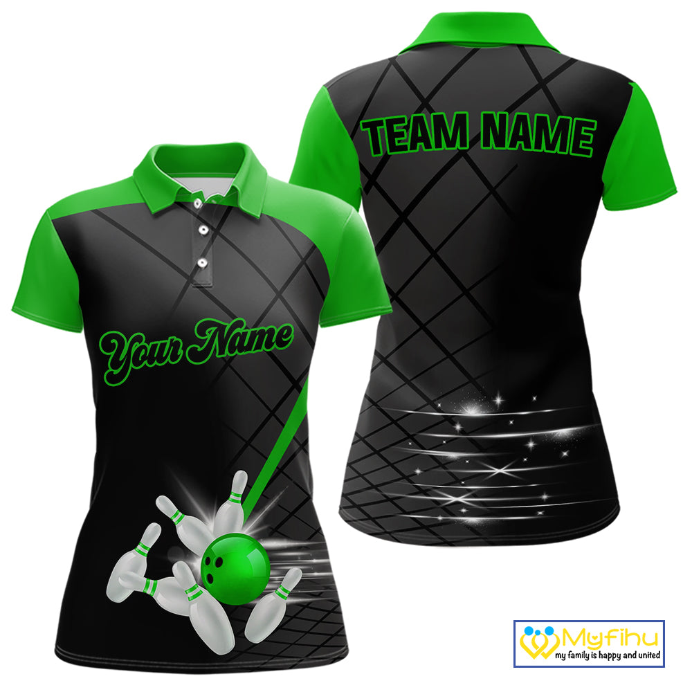 Black & Green bowling league jersey custom Women Bowling Polo, 1/4 zip Shirt, gifts for ladies bowler NQS10096