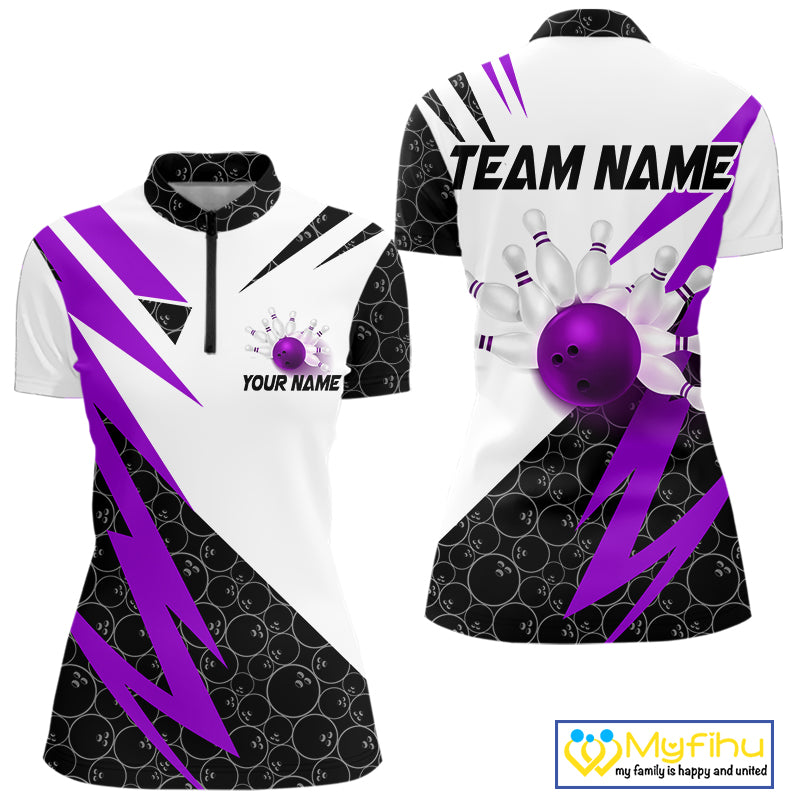 Black & White Bowling Polo, Quarter Zip Shirt for Women Custom Lightning Team bowling jersey | Purple NQS10003