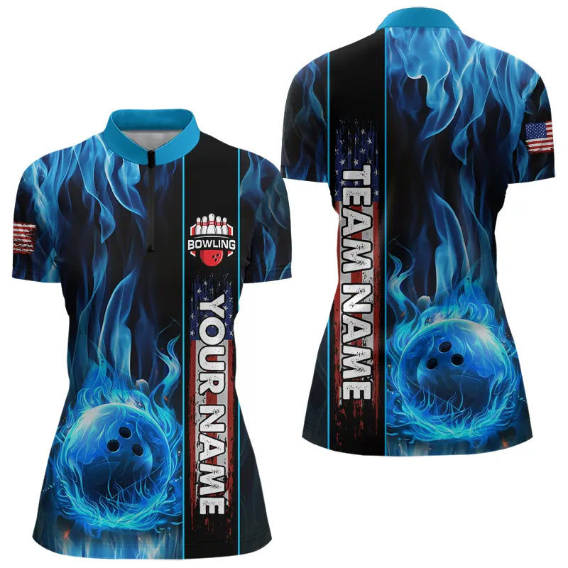 Blue Flame American Flag Women Bowling Polo, Quarter Zip Shirt  Custom Patriotic Bowling Team Jerseys NQS9439