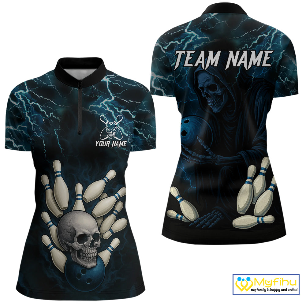 Blue Thunder Lightning Skull Reaper Bowling Polo, 1/4 Zip Shirts For Women Custom team bowling jerseys NQS9849