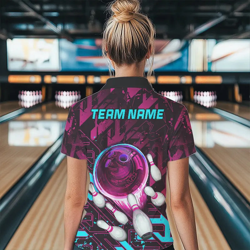 Bowling Polo, Quarter Zip Shirt For Women Custom pink and blue abstract Bowling Team league Jerseys NQS9423