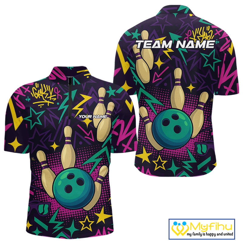 Custom purple graffiti pattern funny Bowling shirts for Men, bowling team league jerseys with Name NQS10270